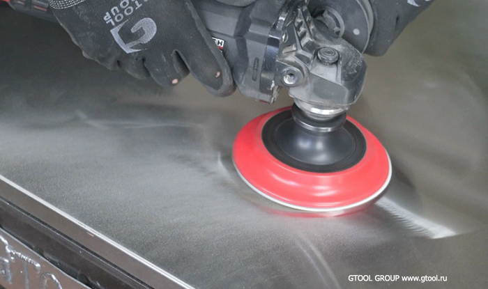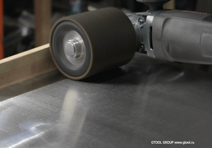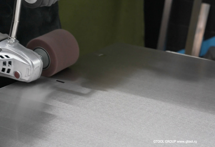 Оптимально использовать надувной барабан с гильзами из нетканого полотна. Такая шлифовка более агрессивная, и может перебивать более крупные царапины и часто позволяет обойтись без шлифовки кругами на липучке, или не выводить так тщательно поверхность.