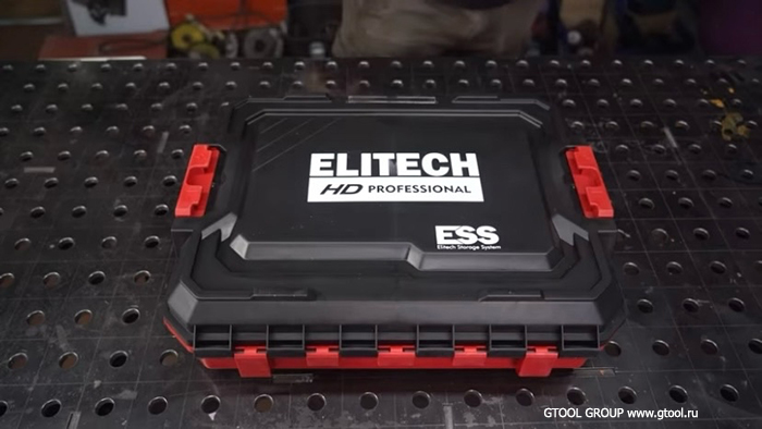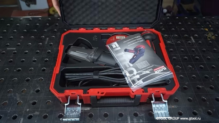 Машина поставляется в прочном пластиковом кейсе с картонной упаковкой. Кейс выглядит солидно, с возможностью стыковки с другими кейсами. Внутри кейса, помимо самой машинки, находятся инструкция, дополнительная обычная зажимная гайка, жесткий шлифовальный диск Elitech, ключ и рукоятка. Кабель машинки имеет длину 3 метра, что вполне достаточно для комфортной работы.