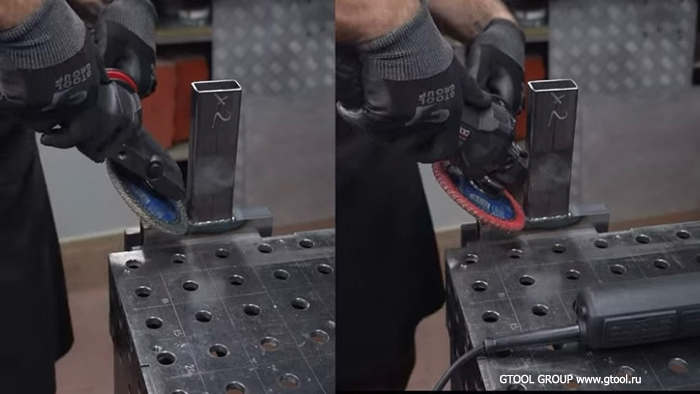 При использовании лепестковых кругов, несмотря на их вес, машинка работает увереннее, так как пятно контакта меньше, и сопротивление ниже.